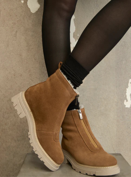 Lined with genuine shearling to the toe, this suede bootie features a rounded toe and a front zipper for easy on-and-off wear.