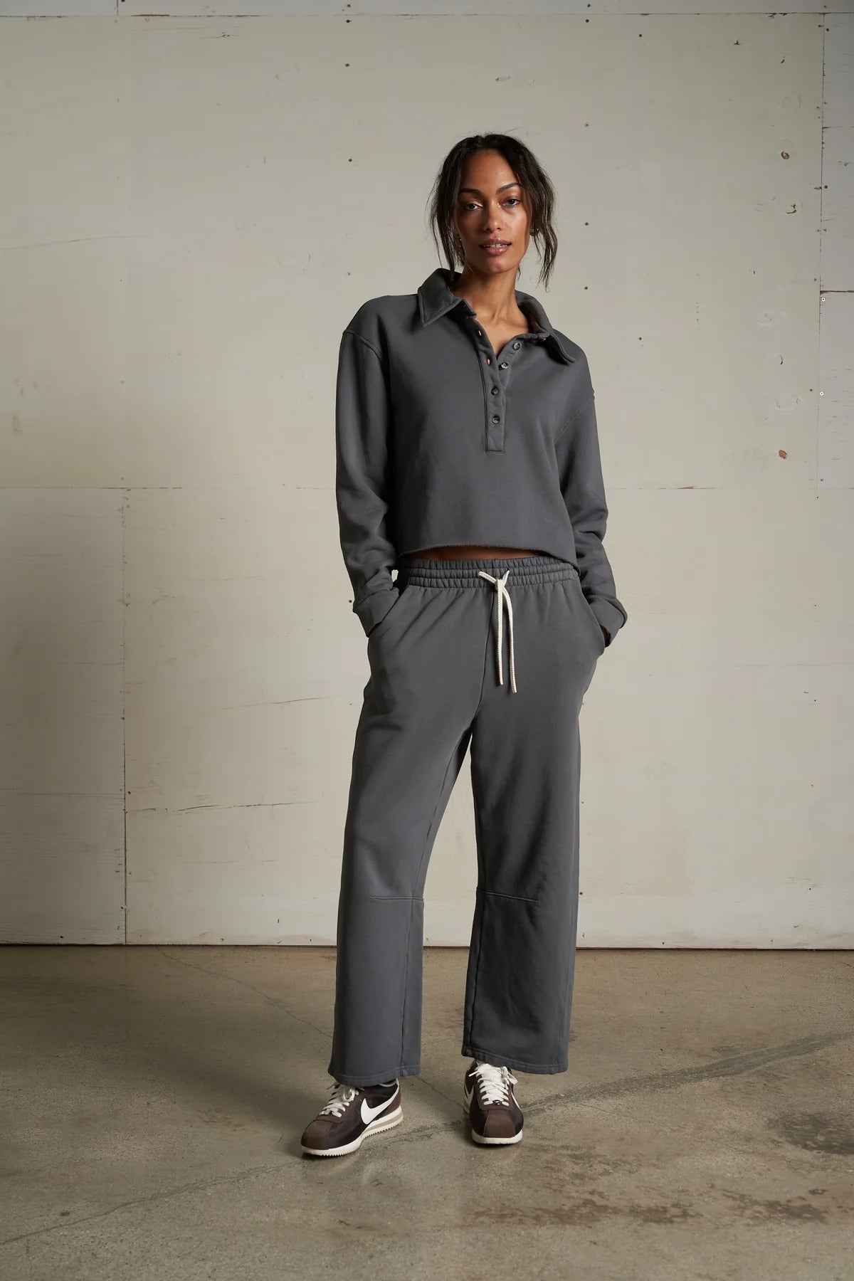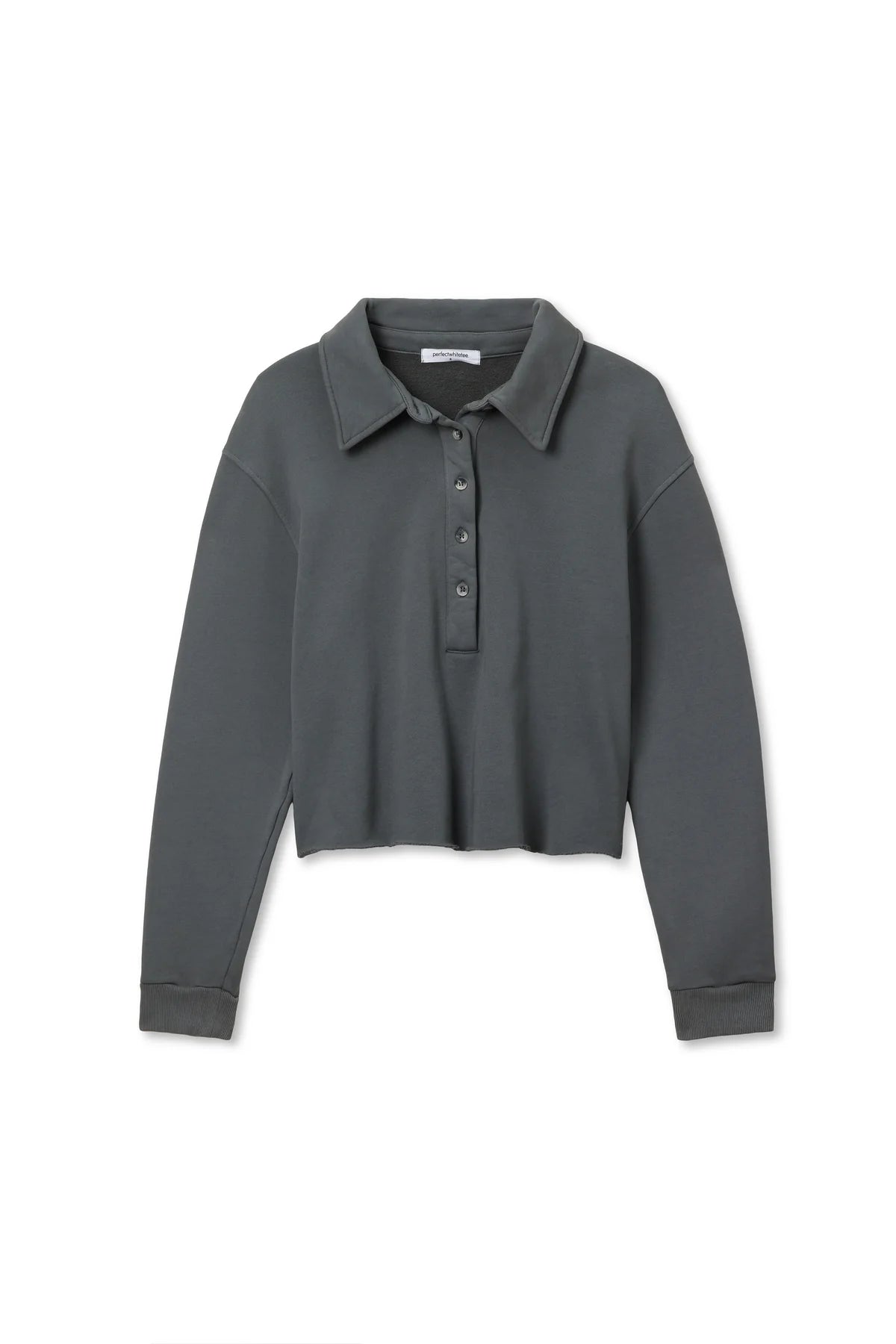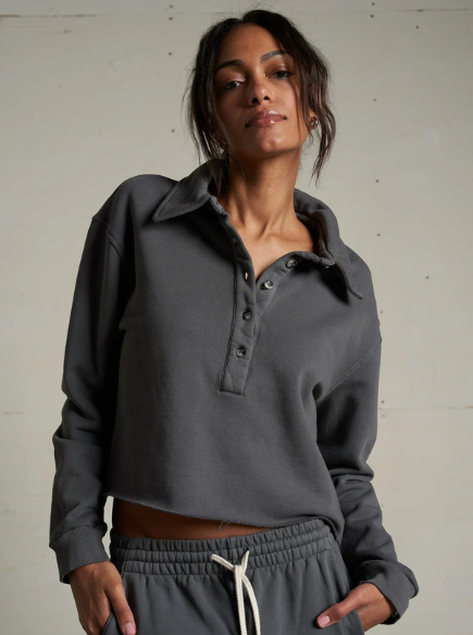 the vinny top is crafted from heavy fleece and finished with a raw hem for a relaxed, lived-in look. designed with a collared neckline and button placket, it brings a polished touch to a casual silhouette.
