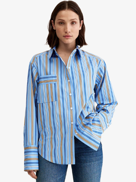 A relaxed fit, this oversized shirt features a classic collar, dropped shoulder seam, patch pocket and a shirttail hem. This garment fits true to size, take your usual size.