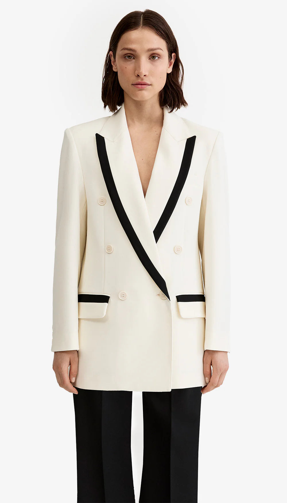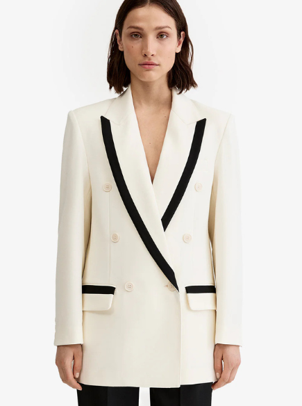 A longline silhouette, this oversized double-breasted blazer features contrast black taping that highlights an extra-long lapel and low pocket placement to emphasize its louche nature. This garment fits true to size, take your usual size.